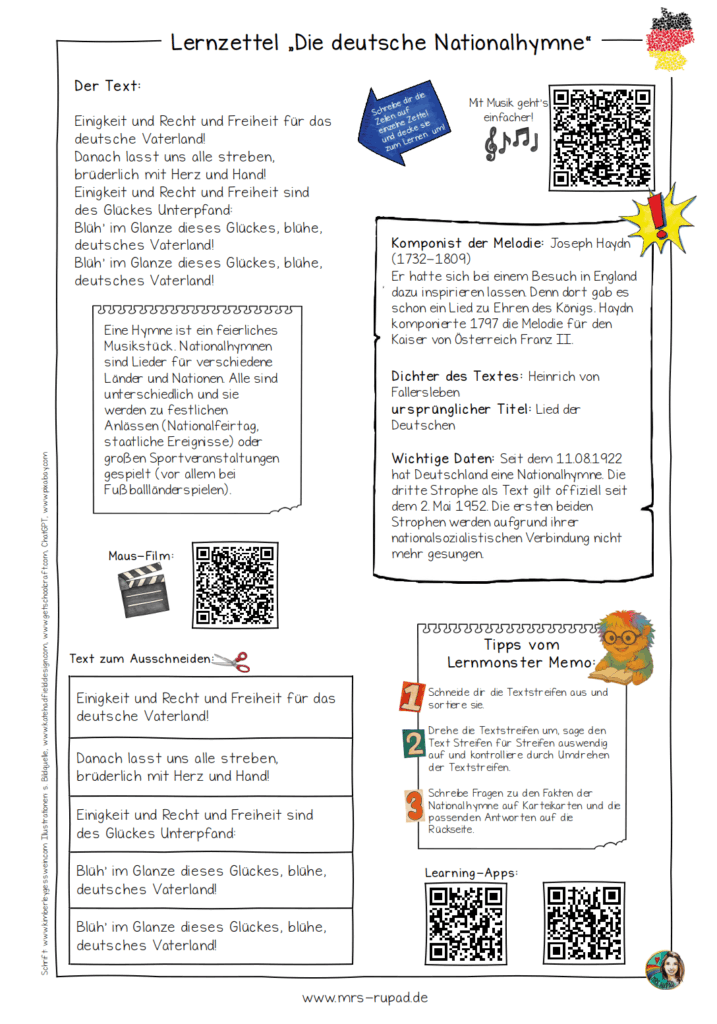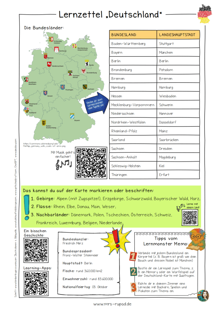 Während der Einheit nutzen die Kinder den Lernzettel als Gedächtnisstütze und als Hilfe zur Bearbeitung von Aufgaben. Sie bekommen den Lernzettel in zweierlei Ausführung: A3 zum Aufhängen zu Hause und A4 zum Einkleben ins Heft. Am Ende der Unterrichtseinheit können die Kinder die Übersichten zum Wiederholen und Üben nutzen. Learning-Apps, Filme oder andere interaktive Materialien sind per QR-Code verlinkt. Zudem gibt das Lernmonster „Memo“ noch Tipps für das Üben zu Hause.